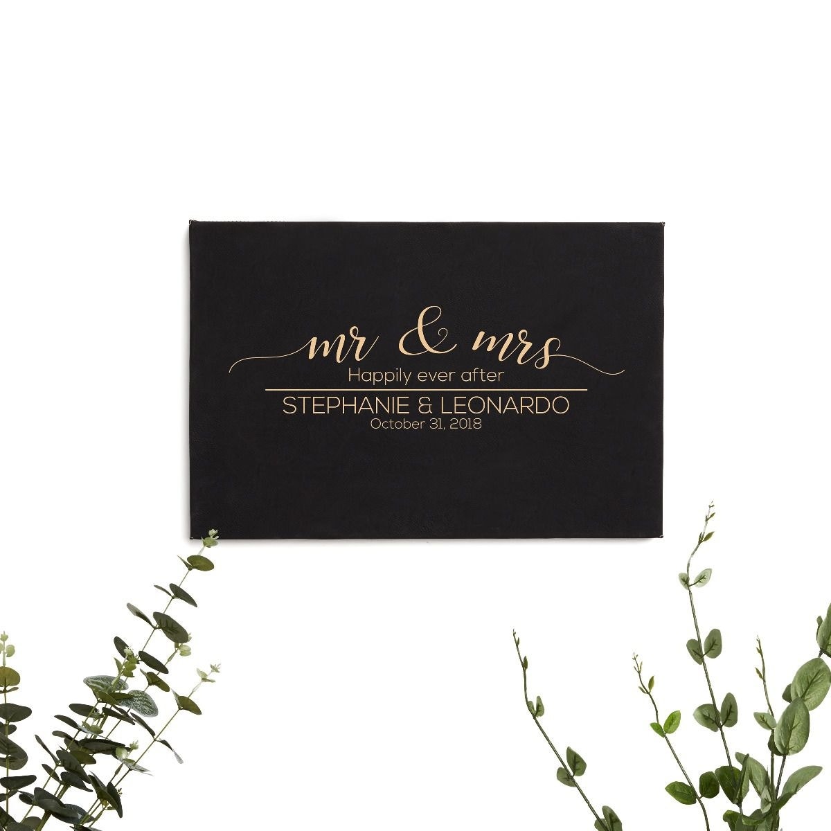 Congratulate the new couple with a gift they can use on their wedding day! This black faux leather wedding guest signature sign can be customized with the couple’s names and/or their wedding date.