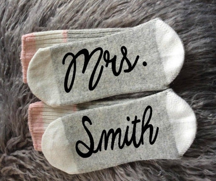 These comfortable and warm socks are perfect for any bride. Plus, you can customize them to have her new last name.