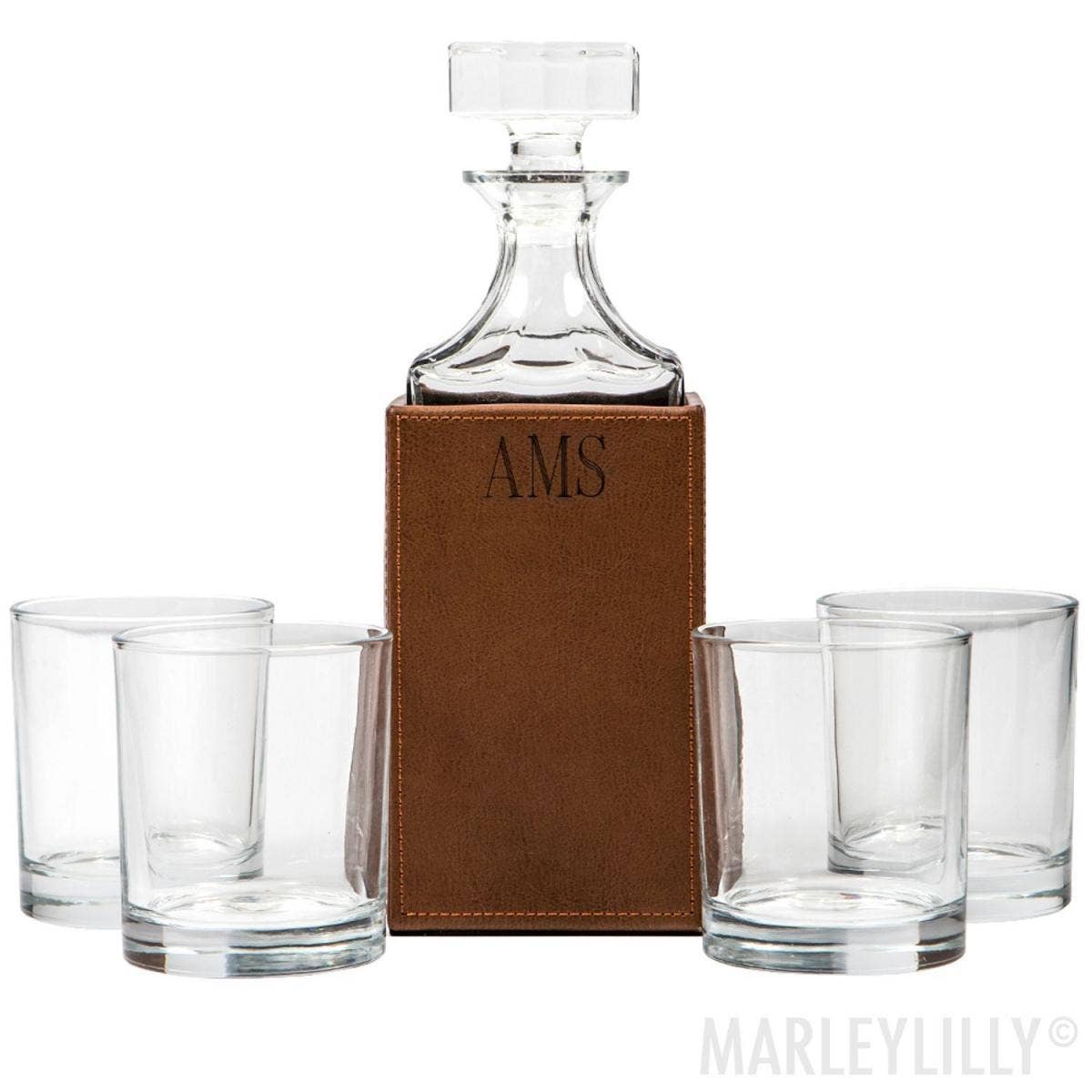 Serve guests in style with this beautiful Personalized Decanter Set. Each set comes with a glass bottle, square glass top, engraved genuine leather wrap and 4 glasses. Each heavy glass decanter holds 64oz of your favorite drink and measures about 10" tall and 4" wide.