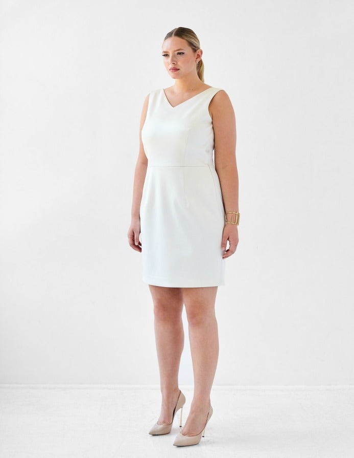 Featuring a gorgeous V back, the dress is made of a premium, structured fabric that has a beautiful sheen. It's perfect for the post-ceremony dancing and drinks, or for the bride that is looking for a low-key option.