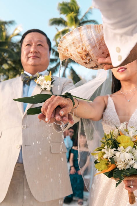 Typically, the officiant then pours fresh coconut water, salty ocean water, or pure water from the lagoon, over the couple's hands to bless them. It's a bit cleaner than pouring sand over your hands!" says Lauren Grech, CEO of LLG.