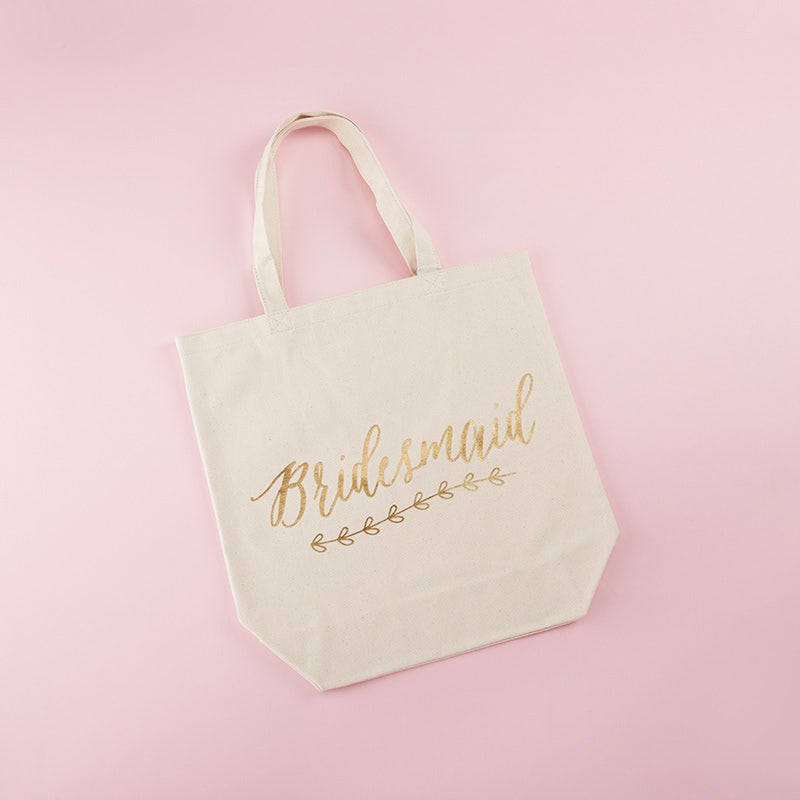 This tote bag is glamorous enough to make your wedding party squeal with joy, and yet, totally appropriate as a bridal shower party favor. Each bag comes with a cute rope handle, a gold foil accent, and a perfectly white body that will look amazing in photos.