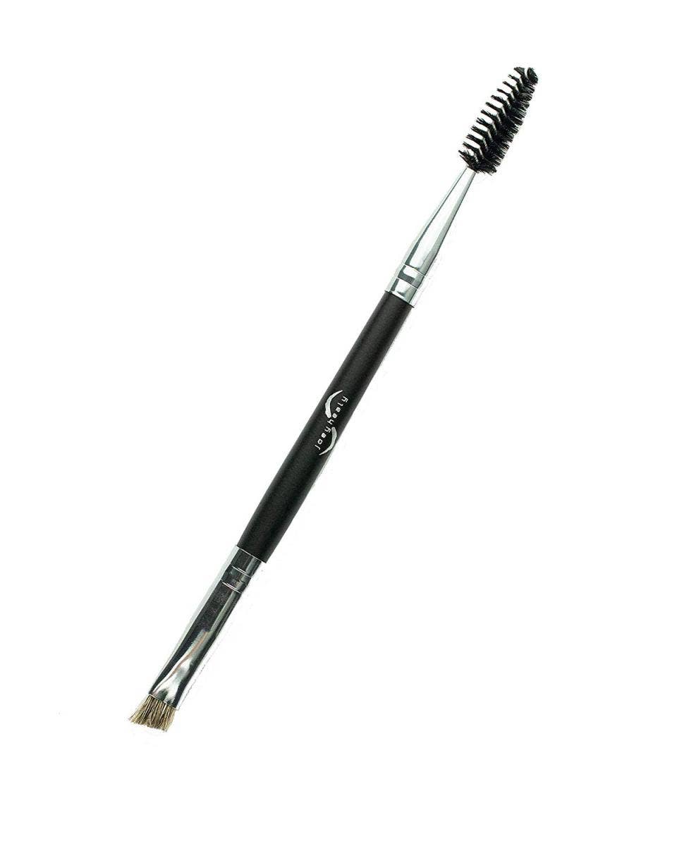 Professional angled brow brush for shaping and defining eyebrows. On one side, the brush has a professional grade angled brow brush for shaping and defining eyebrows. On its other side, the brush has a high quality spoolie for grooming and blending.