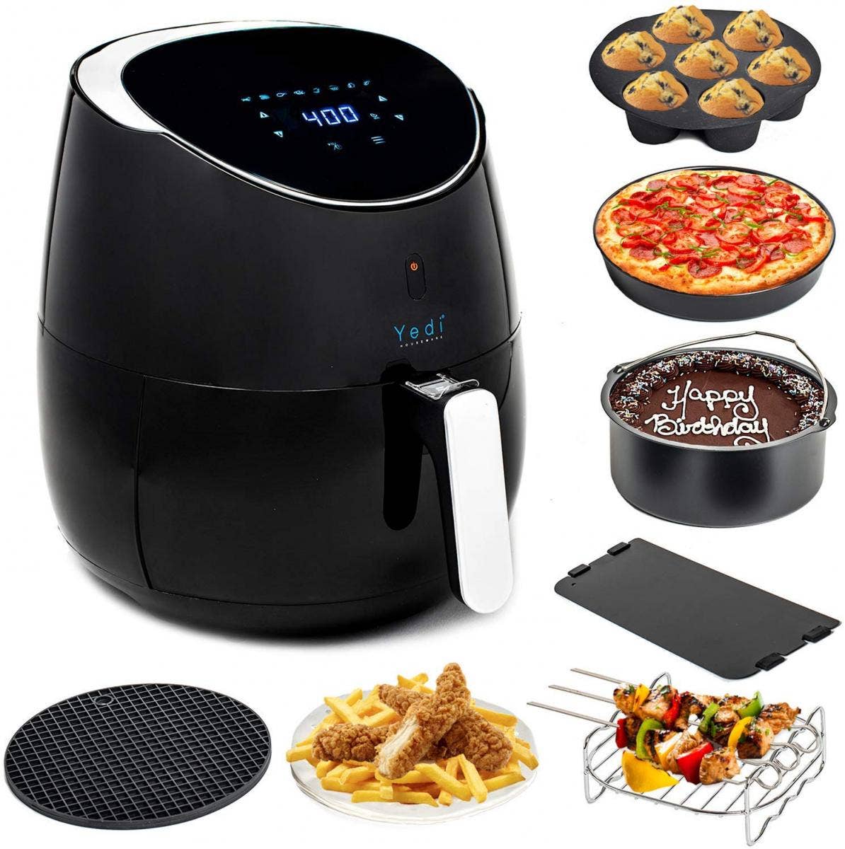 On the LED Digital Touch Screen you can manually set your desired cooking time and temperature, or select from the many built-in smart preset programs. Includes accessories like a Divider for the cooking basket, 50 perforated parchment steaming papers, an 8 inch cake carrel, an 8 inch pizza pan, multi-purpose rack with 3 stainless steel skewers, cupcake silicone pan, and heat resistant rubber mat.