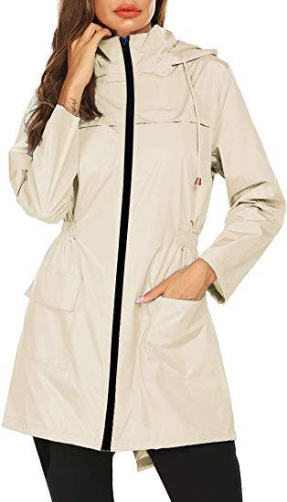 This rain coat has a detachable hood, drawstring waist design, and is breathable with a lightweight casual fit.
