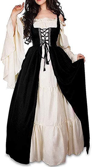 With two wide ruffles, elasticized neckline and sorceress sleeves, front lace-up, shoulder ties and back laces, this dress is sure to make a statement.