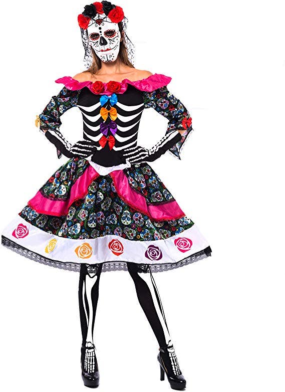 Day of the Dead señorita includes Spanish sugar skull print dress with lace-trimmed off-shoulder pink neckline, corset waist and layered ruffled skirt with tulle hem, gothic long black veil on headband containing black and red roses, mask, skeleton long gloves, and one pair of skull leggings.