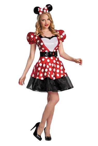 A red dress with white polka dots, belt with sequin bow, character headband and ears. You can also do this one yourself: Get mouse ears, a black bodysuit or turtleneck, tights and cute red shorts.