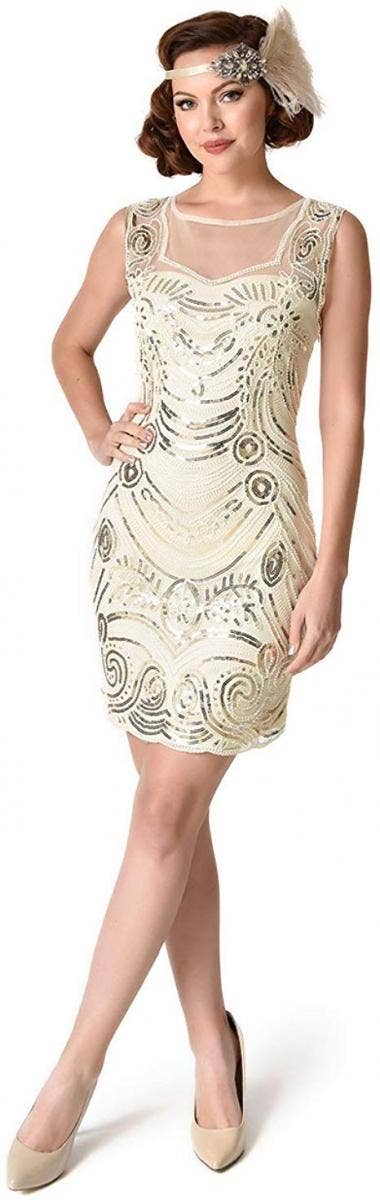 Be a flapper with this vintage 1920s style dress. It has sheer beaded mesh over knit lining.