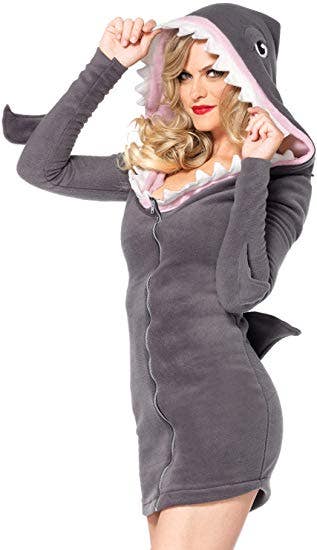 Grey mini dress with hood lined with fabric "teeth" with full length zipper in front, and fins attached to sleeves and back.