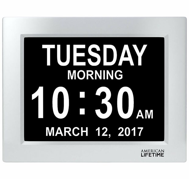 This unique 8" high resolution digital alarm clock clearly spells out the time, period of the day, full day of the week, month and date in large, clear letters. It's the only one of its kind to include 5 multi-function alarms, with the option to set reminders. It also has a battery backup in case of a power outage.