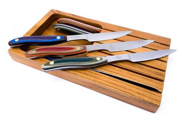 Don't let the colors fool you, these stylish steak knives cut even better than they look. The unique blade has serration where it's needed to protect the edge from cutting on hard ceramic plates, with razor sharp straight edges to finish the cut. Each knife also features a super-thin plunge ground blade and tapered tang for incredible cutting ability and balance. This is a gorgeous set she'll have for life that's been dubbed 'as beautiful as they are useful,' — and that's the truth; the classy, sustainably harvested teak box is handcrafted and made for display while keeping the knives in peak shape.