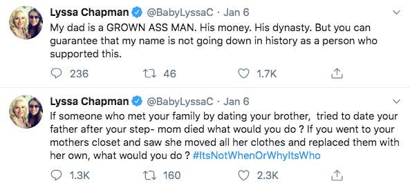 Chapman claimed that a woman named Moon Angell started putting the moves on her father within weeks of Beth's passing. Angell and Lyssa traded heated tweets about it for days. And Chapman also claimed that Angell dated her brother before moving on to her dad!