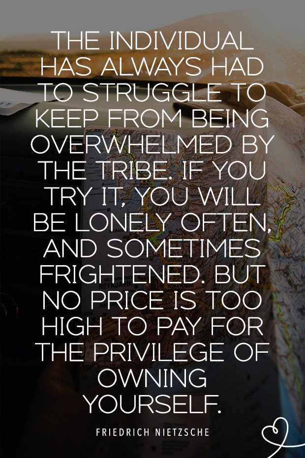 "The individual has always had to struggle to keep from being overwhelmed by the tribe. If you try it, you will be lonely often, and sometimes frightened. But no price is too high to pay for the privilege of owning yourself." — Friedrich Nietzsche