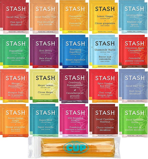Enjoy this 40-count sampler of Stash Herbal and Decaffeinated Tea Bags, with 20 flavors, including chamomile, peppermint, blueberry superfruit, mango passionfruit, orange ginger, mint, chocolate hazelnut, green, vanilla chai, and more!