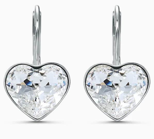 These earrings are made of heart-shaped clear crystals to form the centerpiece. Placed in a discreet, rhodium-plated setting, the hearts refract incoming light brilliantly.