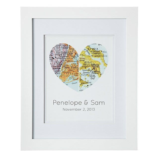 You may come from different places, but your love finally brought you two together. Cutting out half-hearts from vibrant vintage and modern maps, Melissa Schwall merges your worlds together in a charming heart motif. You can add your names and an important date you share to complete this wonderful, thoughtful gift.
