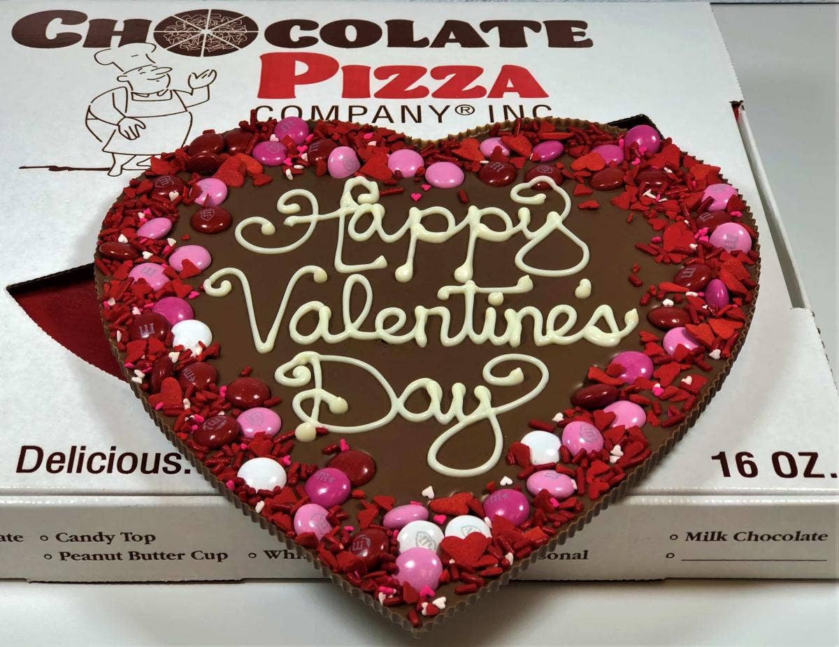 Gourmet milk or dark chocolate blended with homemade English toffee is poured into heart-shaped pizza pan, and then trimmed with red/pink/white chocolate candies and sugar hearts. Choose to write either "Happy Valentine's Day" or "Love You" in white chocolate and serve it in a custom pizza box.