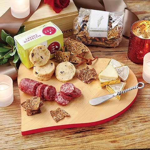An artisan crafted, heart-shaped maple cutting board with red trim and an elegant stainless steel cheese spreader arrive with the makings for a perfect picnic for two. This gift includes soft cheese wedges, salami, herbed crisps, and shortbread cookies, and comes wrapped in a hand crafted wood crate.