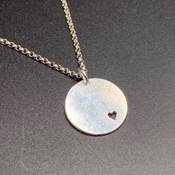 This is a sterling silver coin with a small heart cut out on the pendant. The pendant is on a 16" chain, is handmade, and is quite a romantic gift to give your loved one this year.