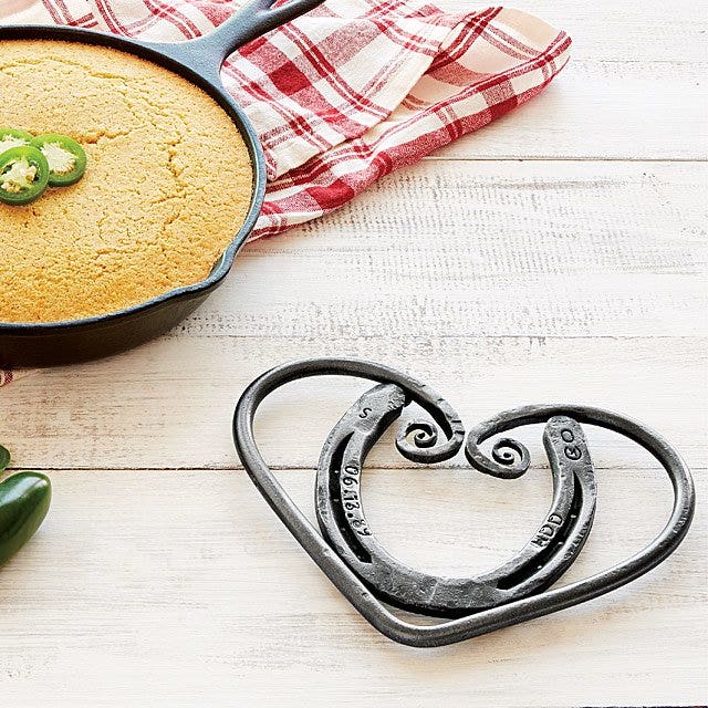 Blending beauty and utility, this horseshoe trivet protects your table and countertops, but it's also elegant enough to display for a touch of rustic romance. Personalize it with your choice of initials, a special date, or both for a memorable gift.