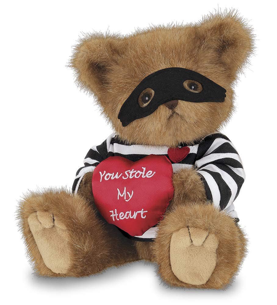 At just 10 inches tall when standing, this teddy bear is in a prisoner uniform holding message heart. The heart reads "you stole my hear," and is a great gift for the one who takes your breath away.