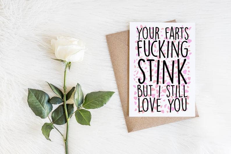 Have a gassy partner? Tell them just how much you love them despite their smelly noxious gas with this hilarious card.