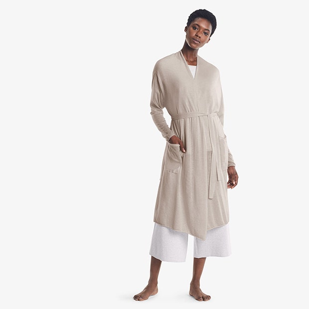 The universal work from home uniform! Lightweight and cozy, this robe has slim sleeves that are easy to roll up. No need to worry about dragging your sleeves through your breakfast or coffee at your desk, and you'll stay comfy all day.