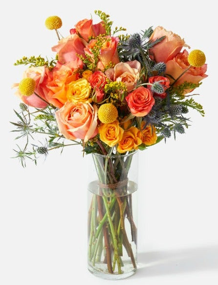 With this gorgeous mix of fiery colors and textures, mom will see just how vibrant her special day can be. And the cool blue tones fit amazingly well alongside the orange roses and golden craspedia.