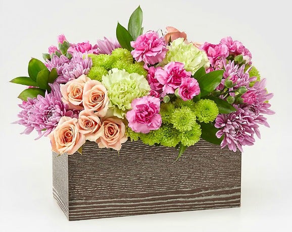 Capture the beauty of this day for mom with this bouquet of peach spray roses, green trick dianthus, pink mini carnations, and lavender cushion pompons. All of the flowers come in a weathered wooden box.