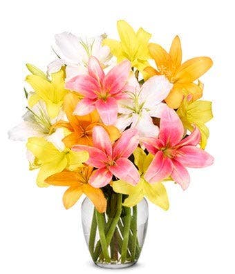 Is mom a fan of lilies? If so, she'll really enjoy this beautiful bouquet of pink, orange, and yellow flower varieties for a perfect kiss of spring.