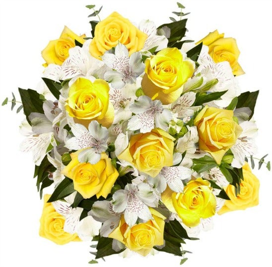 This is a gorgeous arrangement of 12 yellow roses and 10 white Alstromeria, with stems of 4 greens. Though it doesn't come with a vase, so why not get creative with how you contain them?