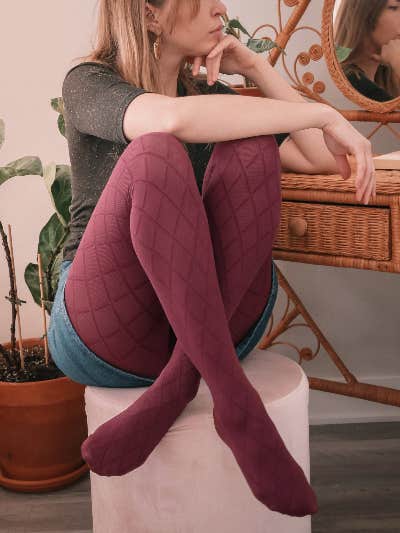 Opaque burgundy tights get an edgy and trendy update thanks to this diamond pattern that will modernize all of Mom's spring looks.