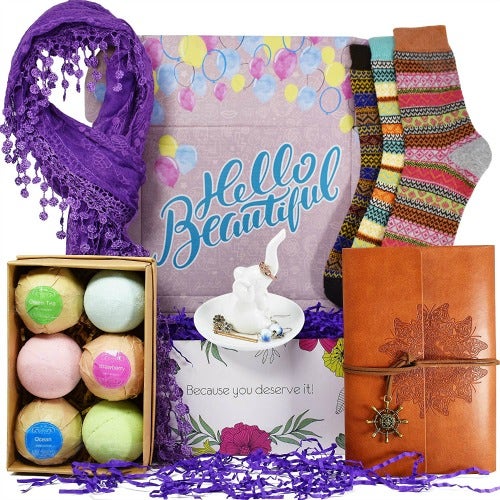 This is a gorgeous little care package that will make a friend, mother, aunt or daughter feel so special. It's beautifully packaged and has 6 bath bombs, cozy socks, a jewelry holder, and a leather-bound journal.
