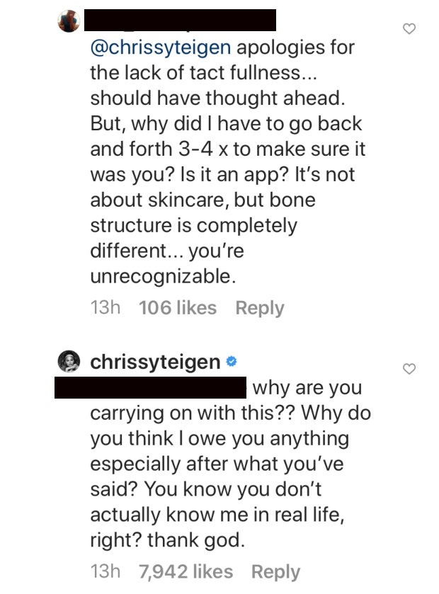 Surprisingly, the initial “dropped 50 lbs or has cancer” comment racked up over 350 likes from fellow Instagram users who apparently felt the same way, and while many came to Chrissy’s defense, the internet troll continued to defend herself. “Apologies for the lack of [sic] tact fullness...should have thought ahead. But, why did i have to go back and forth 3-4 x to make sure it was you. Is it an app? It’s not about skincare, but bone structure is completely different...you’re unrecognizable.”