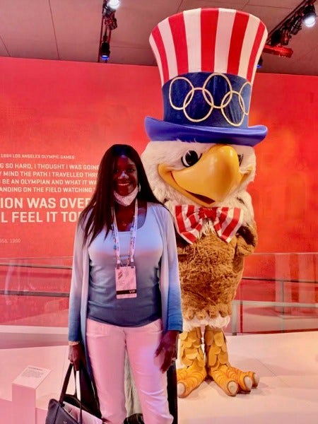 Benita Fitzgerald Mosley in front of the 1984 Olympic mascot