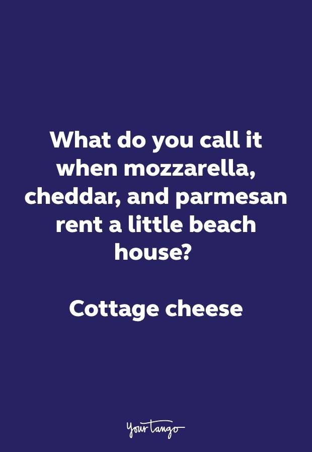 14. What do you call it when mozzarella, cheddar, and parmesan rent a little beach house? Cottage cheese.