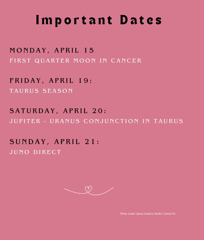 The First Quarter Moon in Cancer will kick off the week, inspiring you to take action on the intention that you set with the New Moon in Aries. Cancer is the sign of home and family, so this could help you understand how to ground a great love affair into your everyday life or figure out how to more aptly progress your relationship into becoming true life partners. While the official Eclipse Portal closed on April 8 with the Aries Solar Eclipse, the energy will linger until the Full Moon in Scorpio at the end of April, so be mindful of events and timelines still having the ability to shift rapidly during this time.