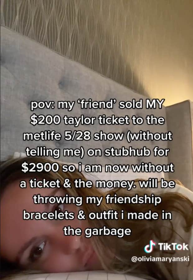 Olivia posted a POV TikTok, stating, “My ‘friend’ sold MY $200 Taylor ticket to the MetLife 5/28 show (without telling me) on StubHub for $2,900 so I am now without a ticket and the money. Will be throwing my friendship bracelets and outfit I made in the garbage.”