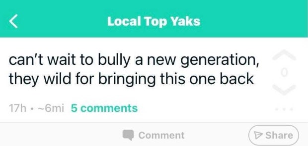 Yik Yak was hugely popular in my town when I was in high school, and my town was very good at making it a wholesome place to be, throwing compliments to people they didn’t know very well and just making jokes about school.