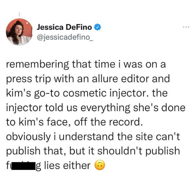 "Remembering that time I was on a press trip with an Allure editor and Kim's go-to cosmetic injector," DeFino wrote in a tweet.