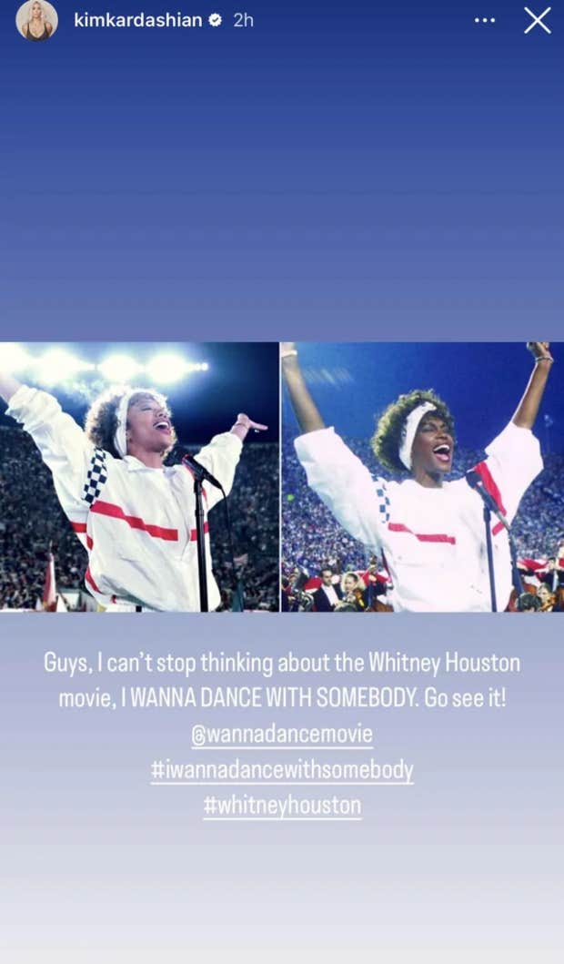 The SKIMS founder posted an Instagram story promoting "I Wanna Dance With Somebody," a movie starring Naomi Ackie as Houston and Stanley Tucci as Clive Davis.