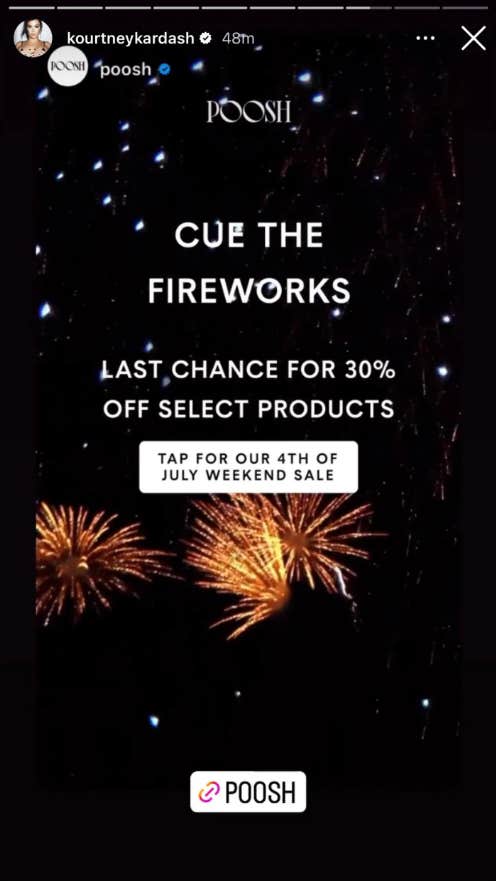 “Cue the fireworks. Last chance for 30% off select products. Tap for our 4th of July weekend sale,” read the Instagram post she shared on her story just hours later.