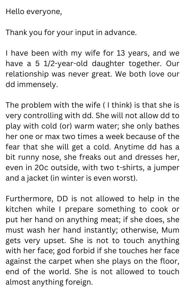 The man says that his wife is “obsessively controlling” of their daughter. “She will not allow DD [dear daughter] to play with cold (or) warm water; she only bathes her one or a maximum of two times a week because of the fear that she will get a cold,” he writes. He says his wife "freaks out" whenever their child shows signs of illness and, even in mild weather, dresses her in "two t-shirts, a jumper, and a jacket."