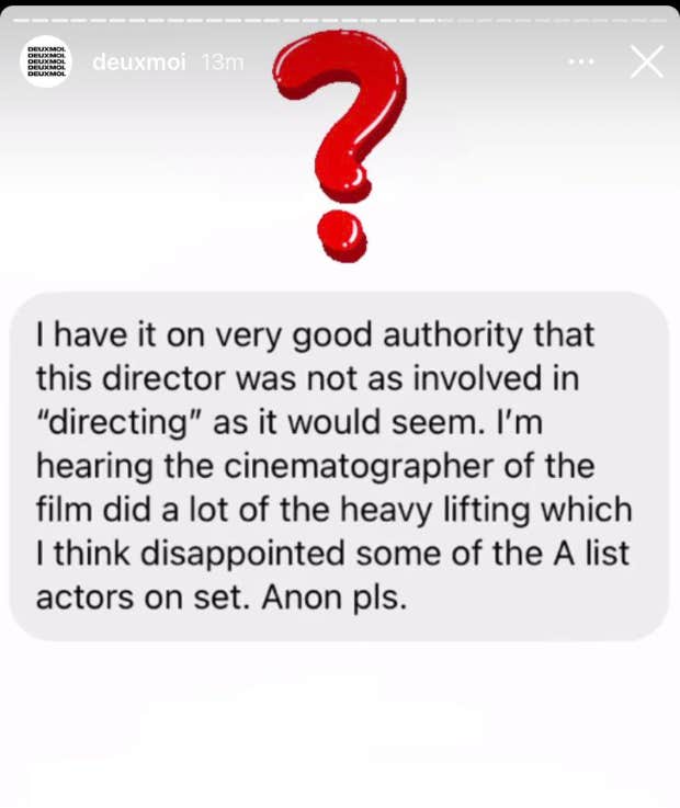 "I have it on very good authority that the director was not as involved in 'directing' as it would seem," the post read, adding that the cinematographer on set had to step in and do most of the work, which allegedly angered some of the A-list actors on set.