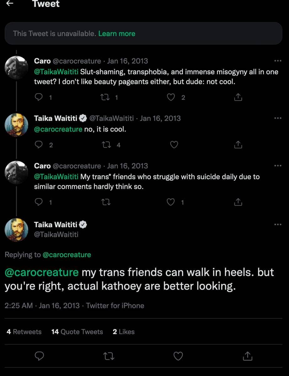 After this series of tweets, Waititi was called out by a Twitter user that went by “@carocreature,” who said “Slut-shaming, transphobia, and immense misogyny all in one tweet. But dude, not cool.”