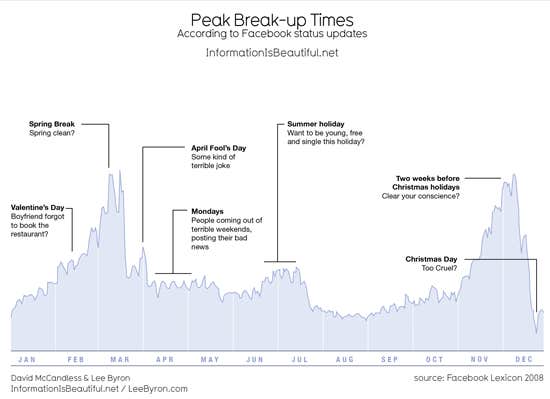 They scraped 10,000 Facebook status updates looking for the words "break-up" or "broken-up" over the course of a year, and formatted their research findings into an infographic, which McCandless presented during a TED Talk.