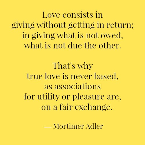 4. "Love consists in giving without getting in return; in giving what is not owed, what is not due the other. That's why true love is never based, as associations for utility or pleasure are, on a fair exchange." — Mortimer Adler