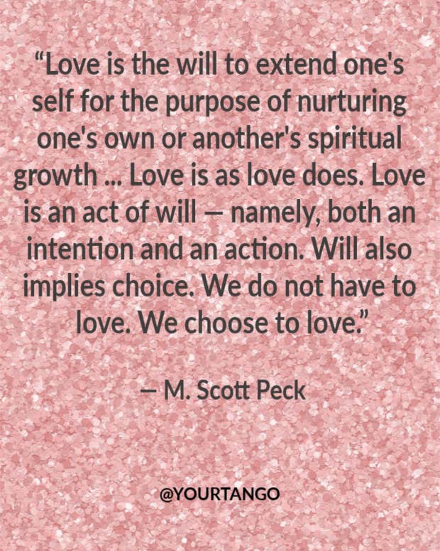 "Love," he said, "is the will to extend one's self for the purpose of nurturing one's own or another's spiritual growth ... Love is as love does. Love is an act of will — namely, both an intention and an action. Will also implies choice. We do not have to love. We choose to love.”