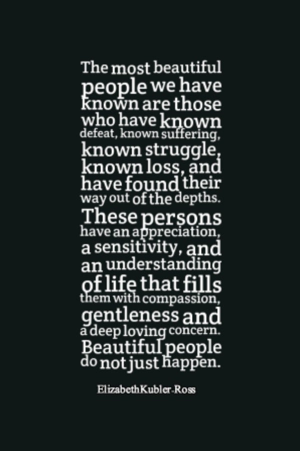 4. “The most beautiful people we have known are those who have known defeat, known suffering, known struggle, known loss, and have found their way out of the depths. These persons have an appreciation, a sensitivity, and an understanding of life that fills them with compassion, gentleness and a deep loving concern. Beautiful people do not just HAPPEN.” — Elizabeth Kubler-Ross